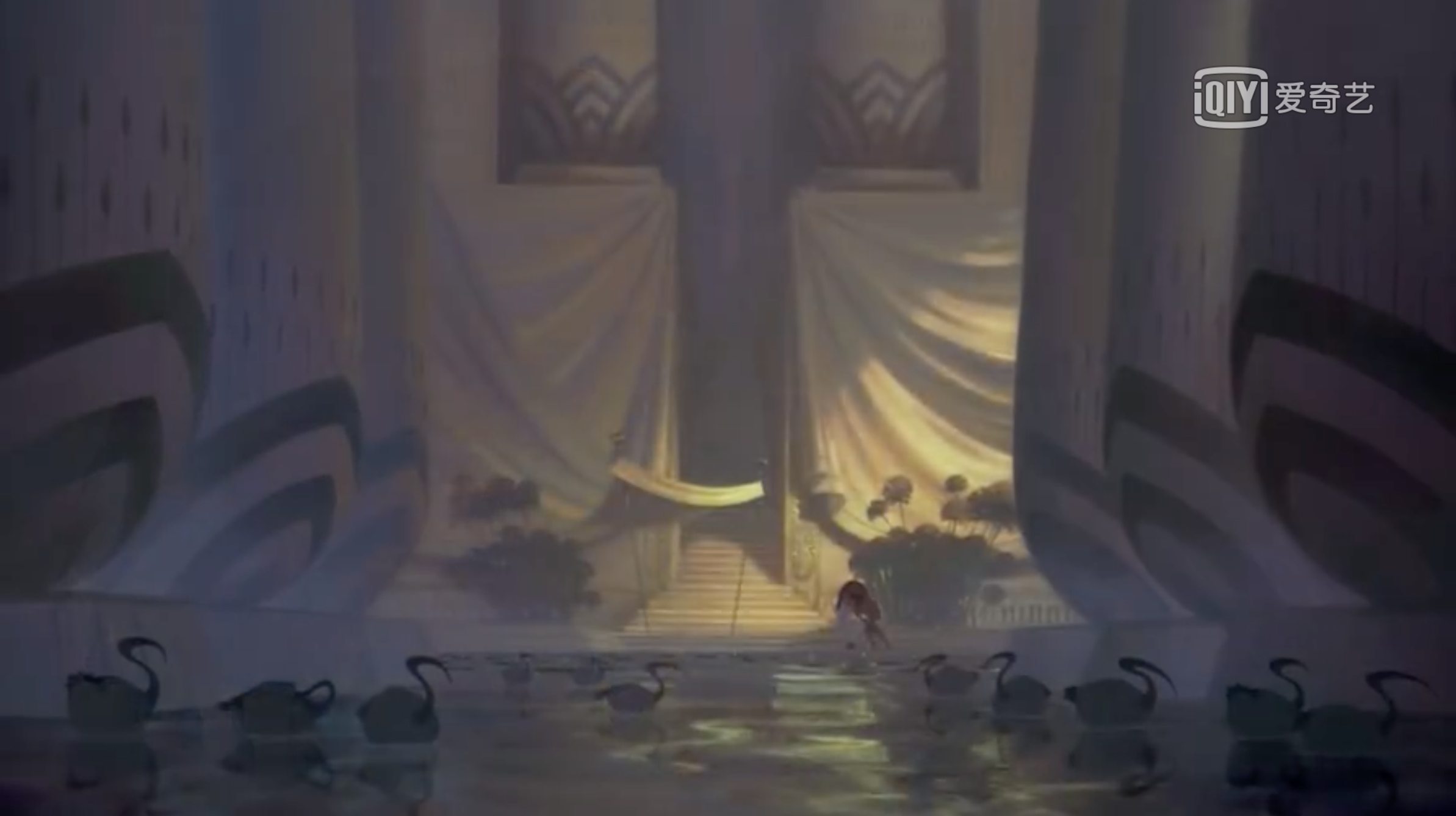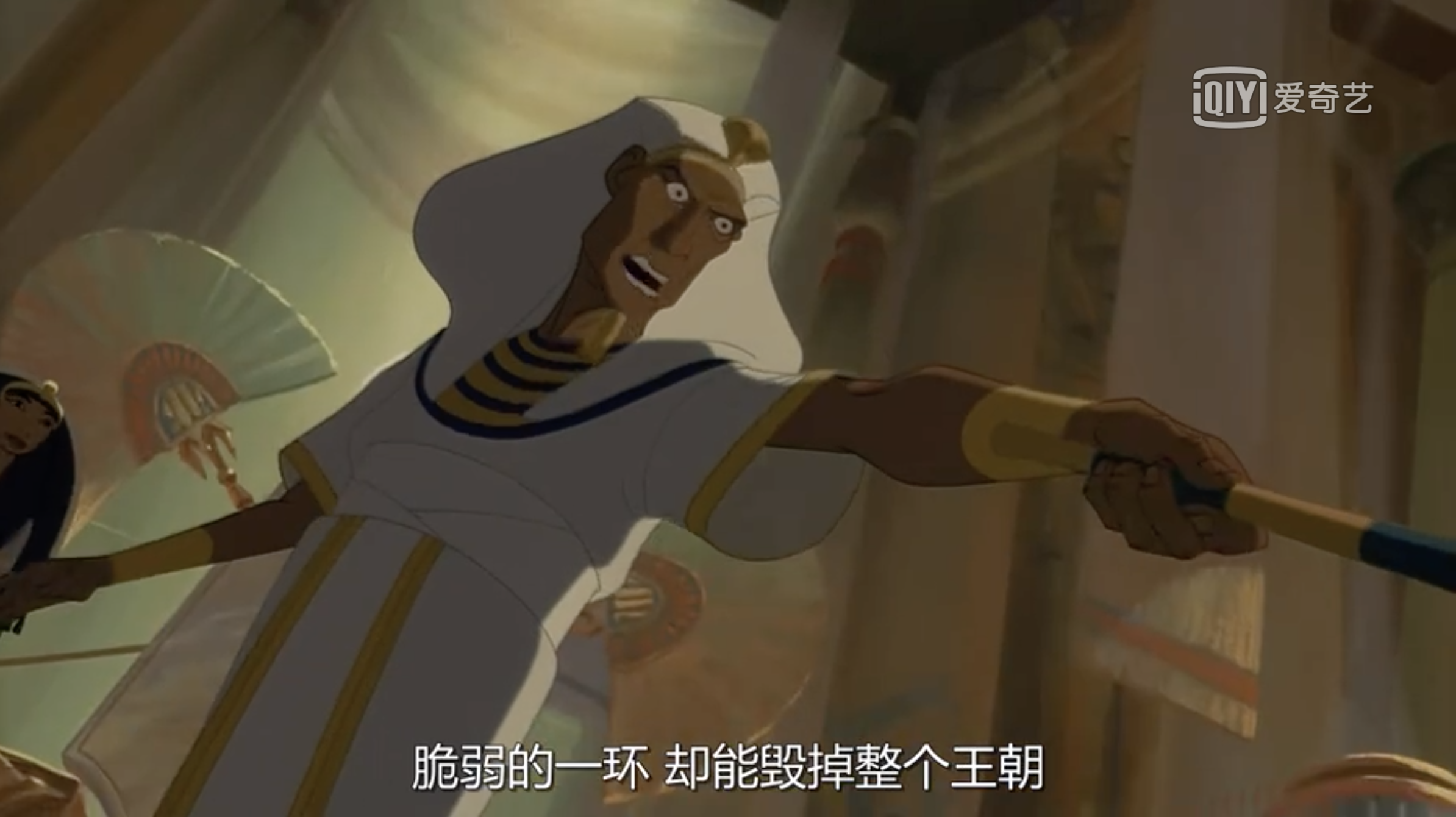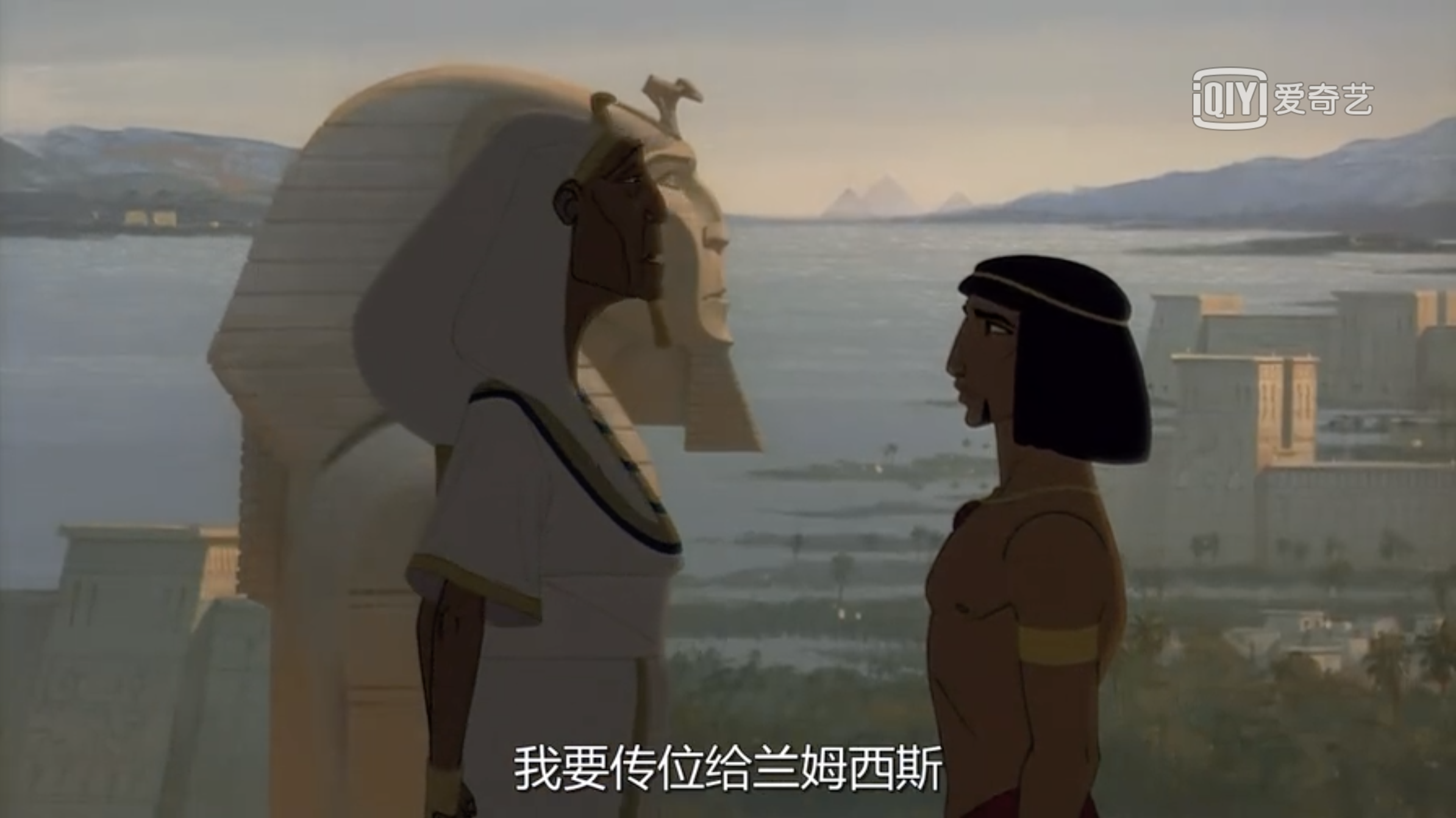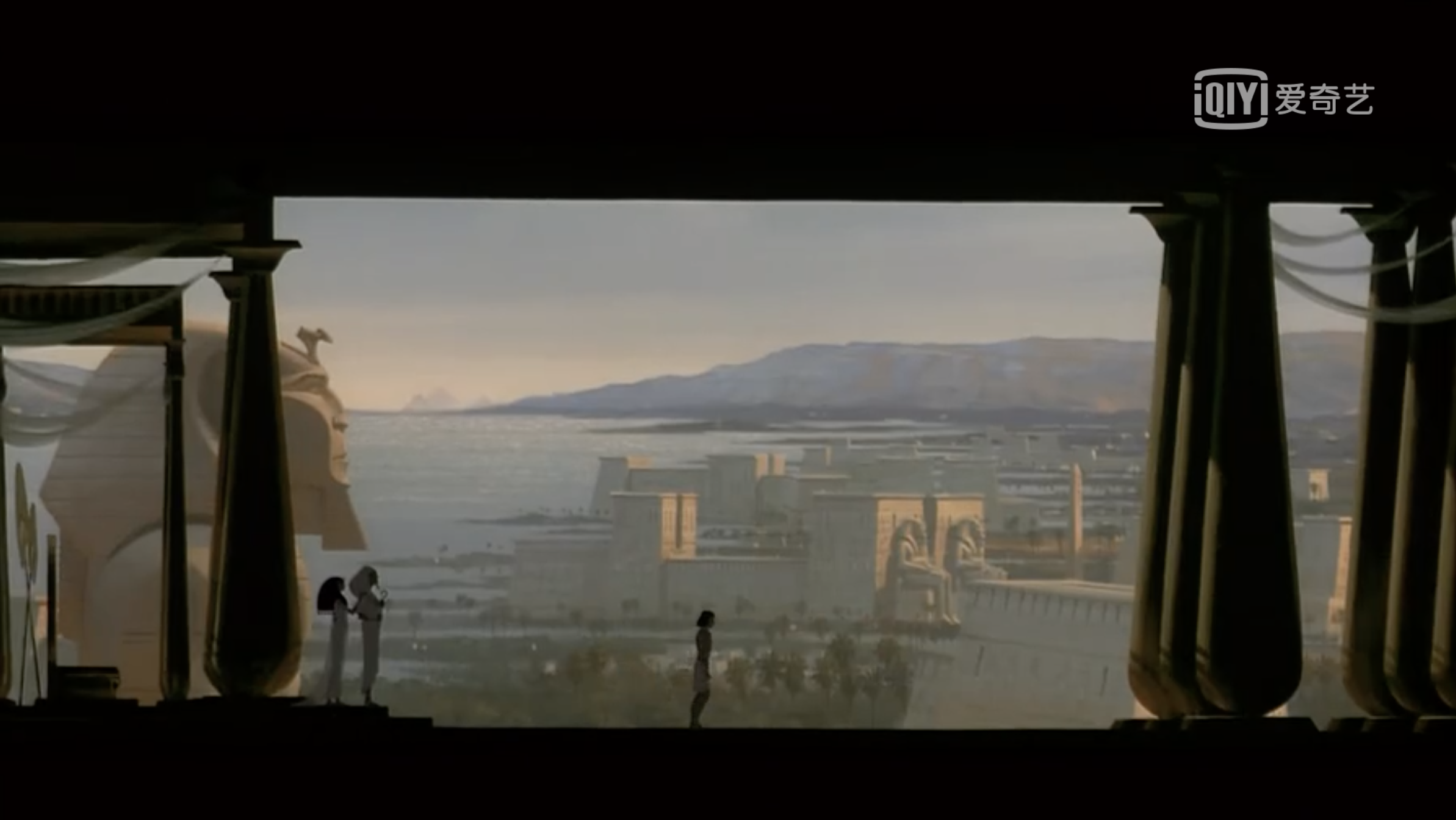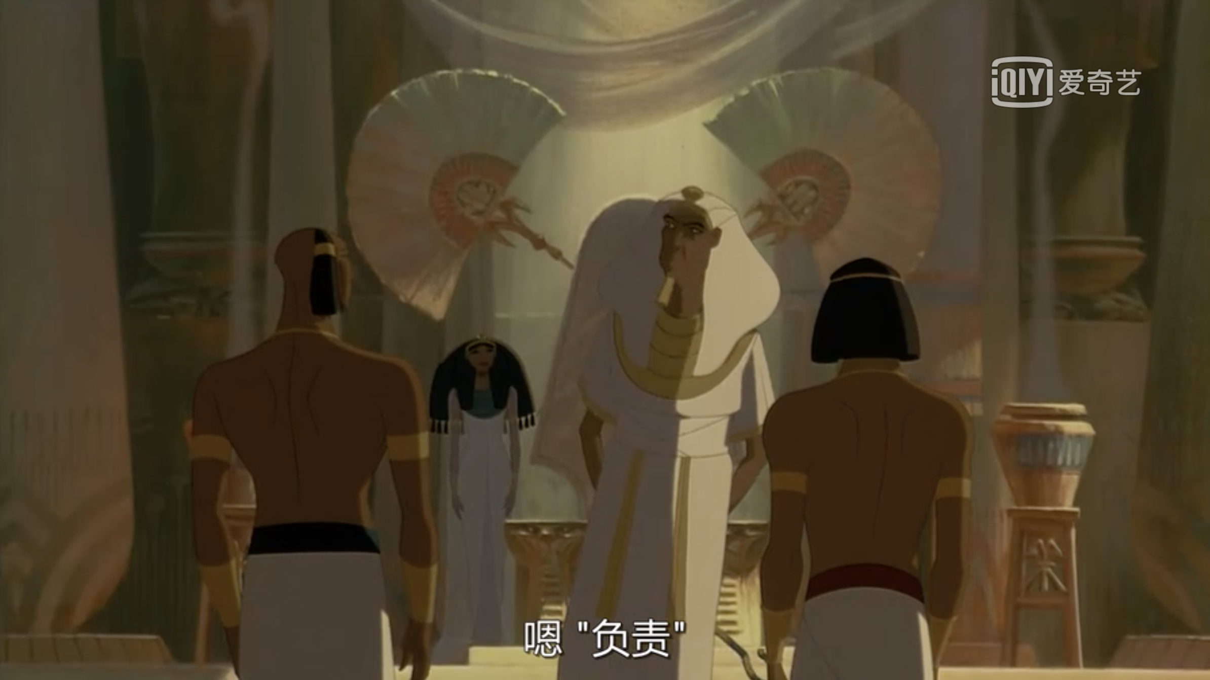 皇后一开始出现,以及摩西知道真相后去寻求母后帮助的场景,都是这个莲花池。用这种充满生机的池塘、植物,柔和的色调,和老法老出现的场景,以及奴隶被奴役的场景形成对比。塑造了母后和蔼、柔美的形象。