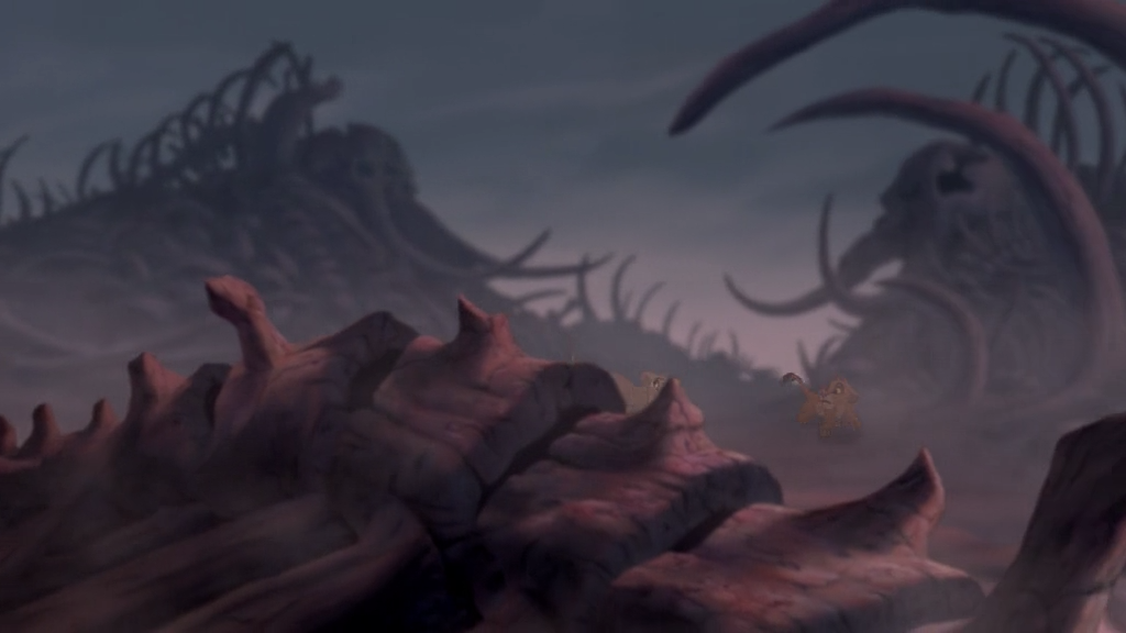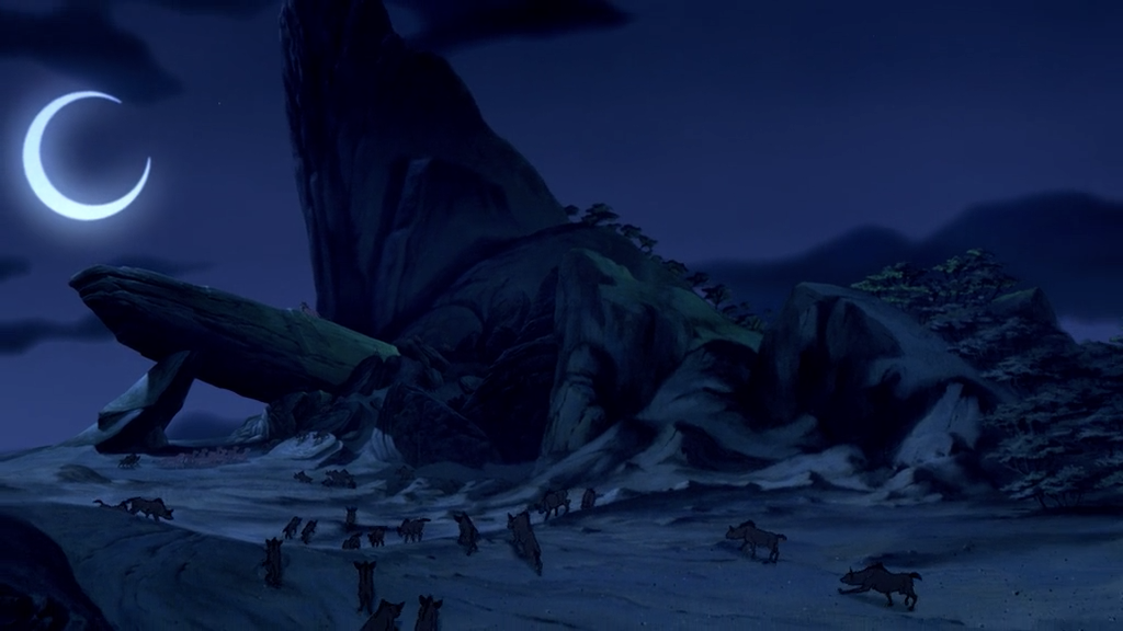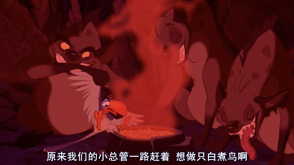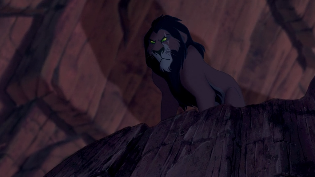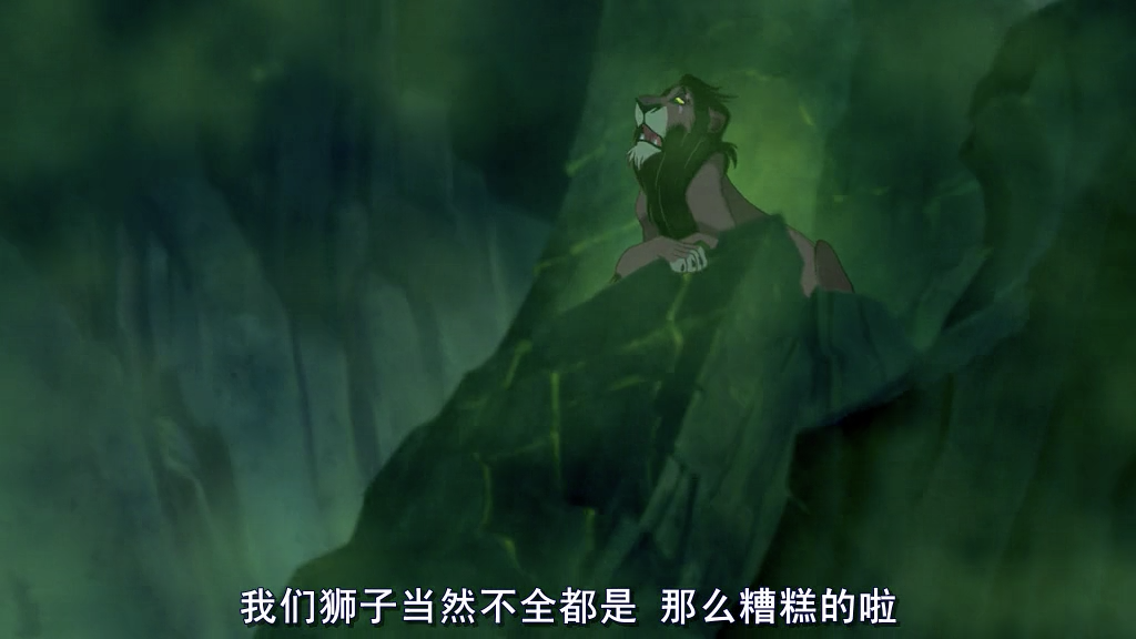 除了对画面整体情绪的影响之外,色调还能形成对于整个空间的理解。如上图木法沙所在的明亮温暖的空间和刀疤所处的阴暗诡异的空间。