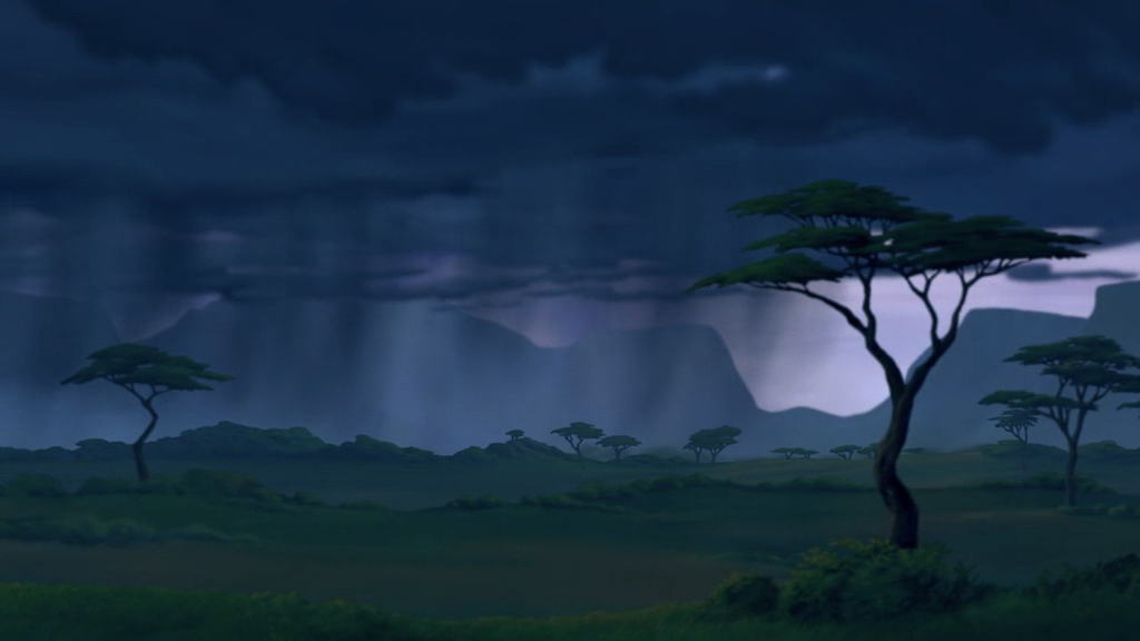 整个画面由蓝色、绿色、紫色整体构成,这样的画面构成中没有一点暖色成分,有效地刻画了非洲草原大雨前的阴郁、低沉的气氛。