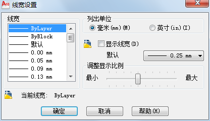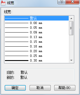 (1)在【图层特性管理器】对话框中,单击【线宽】栏中的对应图标,系统将打开【线宽】对话框,如图所示。 用户可从中选择一种所需的线宽,随后单击【确定】按钮即可完成线宽设置。