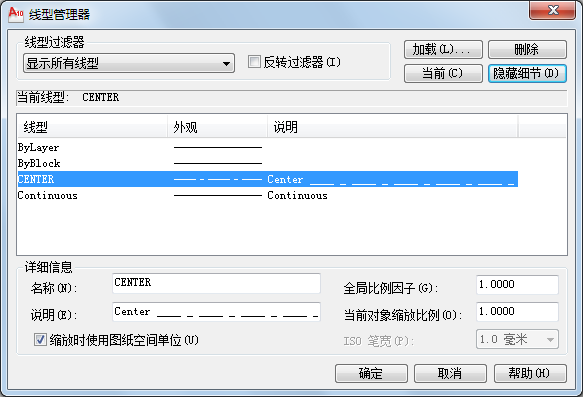 (3)有时,由于线型的比例不合适,绘制出的图形线条不能正确反映线型,如虚线、中心线等显示仍为实线。 此时,可单击菜单中【格式】》【线型】命令,从弹出的【线型管理器】对话框中单击【显示细节】按钮,展开【详细信息】选项区,如图所示。在该选项区中,设置【全局比例因子】的数值,可调整和改变整个图形中所有对象的线型比例;设置【当前对象缩放比例】的数值,可改变新创建对象的线型比例。 例如,若当前图形的中心线显示为实线,可通过改变【全局比例因子】放大或缩小,使得中心线得以正常显示;或设置【当前对象缩放比例】的大小,使得后续绘制的中心线正常显示。 此外,若要修改已经绘制的某对象的线型显示比例,还可双击该对象,从打开的【特性】选项板中【线型比例】栏中设置新的显示比例即可。