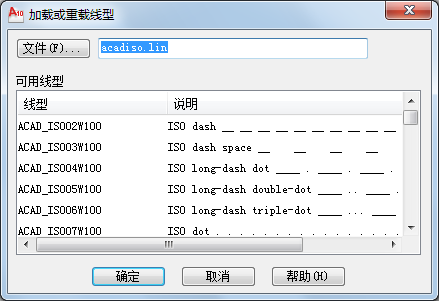 (2)倘若在上述【已加载的线型】列表中没有合适的线型可选,用户可单击其下方的【加载】按钮,从弹出【加载或重载线型】对话框的【可选线型】列表中选择需要加载的线型,然后单击【确定】即加载完成,如图所示。 此时,系统自动返回【选择线型】对话框中,用户可再次选中刚刚加载的线型并单击【确定】按钮,将该线型加载到指定的图层中。