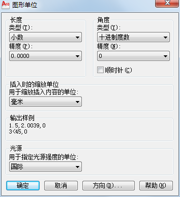 所谓设置绘图单位,实际上是指定义绘图时所使用的长度单位和角度单位的格式以及它们的精度。在AutoCAD中,屏幕上显示的只是图形单位。图形单位不能反映实际尺寸的 大小,所以在绘图前必须基于要绘制图形的类型确定一个图形单位所代表的实际大小(如代表实际的1mm、1m,还是1km等),然后再据此创建实际大小的图形,这样也有利于通过缩放在度量衡系统之间进行图形转换。通常,如果绘制机械设计图,单位选用毫米;如果绘制建筑设计图,单位选用米;如果绘制城市规划图,单位选用百米或千米。