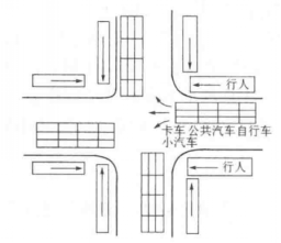 各项调查所获得的交通资料,经过整理和数学处理,可列成总表,有时为了分析比较和一目了然,也可绘成曲线图或柱状图(直方图)。这些图的绘法基本上与路段交通量调查的方法相同,可以参考使用。对于交叉口交通调查的结果多用流向流量图来表示,图3为分车种(小汽车、公共汽车、卡车和自行车以及行人)的流向流量示意图。