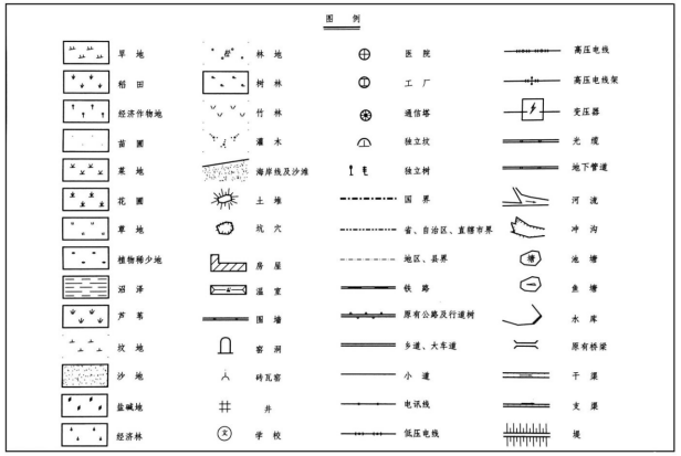 (3)画出平面图中的图例。其中稻田和经济作物等图例的画注位置,应朝向正北方向,涵洞等建筑物除画出图例外,还要注上里程桩号。所有图例均用细实线绘制。