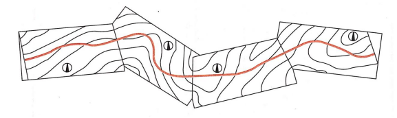 (4)在图纸的边上垂直于路线用点画线绘出接图线(细点划线),并画出指北针(或坐标网);每张图纸的右上角绘出角标,注明图纸序号及总张数。