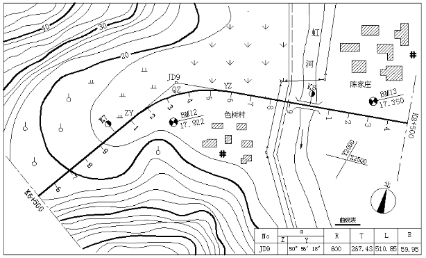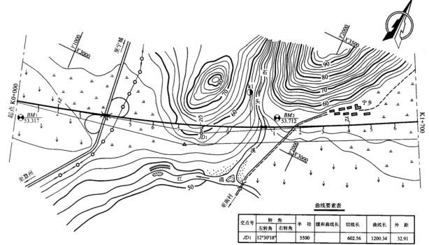 路线平面图是绘有道路中心线的地形图,是表示路线的走向和平面线型状况,以及沿线两侧的地形、地物等内容的图样。
