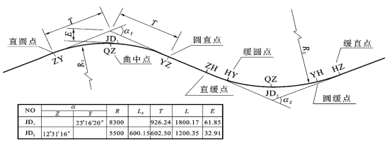 图中控制曲线位置要素的标记:JD表示直导线的交点,ZY和YZ表示圆曲线与前后直线的切点;QZ表示曲线的中点;ZH和HZ表示缓和曲线与前后直线的切点;HY和YH表示圆曲线与前后缓和曲线的切点。图中控制曲线形态要素的标记:αz为左偏角,αy为右偏角;R为圆曲线的设计半径;T为切线长;L为曲线长;Ls为缓和曲线长;E为外矢距。图中应在适当位置列出曲线表,注写各交点的形态要素。