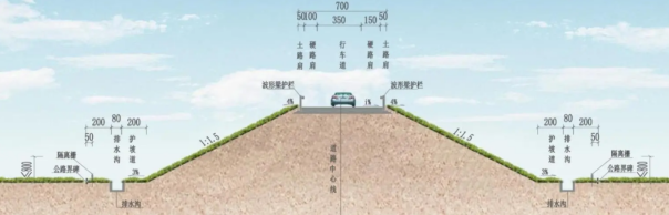 公路路基横断面中两侧路肩外缘之间的与行车直接有关的那一部分称为路幅,包括中间带(当设置中间带时)、行车道路面、路肩等;而边坡、边沟和挡、防构造物等则称为路幅以外部分。根据路线平、纵断面设计以及超高、加宽计算可得到路幅中各部分的横向尺寸和设计标高,从而决定路基横断面的填挖情况,再根据地质、水文等情况来决定路幅以外部分的形状和尺寸。正由于地形、地质、水文、填挖等情况的不同而使路基横断面表示出各种各样的形式。