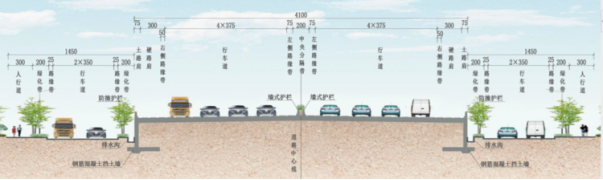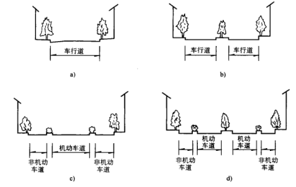 ④四幅式:由三条分隔带或绿化带将车行道分为四部分的断面形式。其中,靠近中央分隔带的两条车道为机动车道,靠近路边的两条车道为非机动车道。这是渠化交通和完全分道行驶的理想布置形式,但用地较多。