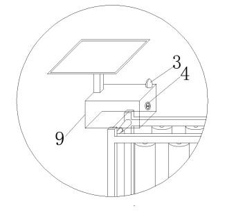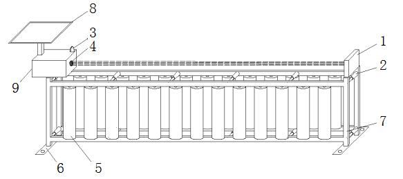 其中,附图标记:1-红外线接收器;2-伸缩弹簧杆;3-警报灯;4-红外线发射器;5-橡胶滚筒;6-底座;7-矩形框主体;8-太阳能板;9-处理盒。