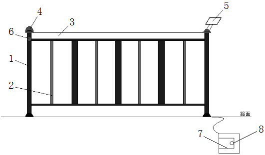 本实用新型的作用原理在于:在红外线发射器4和红外线接收器1中间形成一段闭合回路,红外线发射器4和红外线接收器1之间形成一条红外警戒线,若红外线光束中间被阻断,则说明中间段有物体或有行人正在翻越护栏,此时这一变化经处理盒9分析处理后传送至警报灯3,随即警报灯3会开始闪烁警报,电能来源由太阳能板8发电提供。