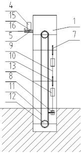 图中:1、立杆架体 2、横杆 3、绳索 4、地槽 5、架槽 6、横杆升降电动机 7、从动链轮 8、压线导轮 9、钢丝绳 10、导轮 11、链条 12、驱动链轮 13、配重块 14、电动机 15、压片 16、行程开关 17、LED灯。