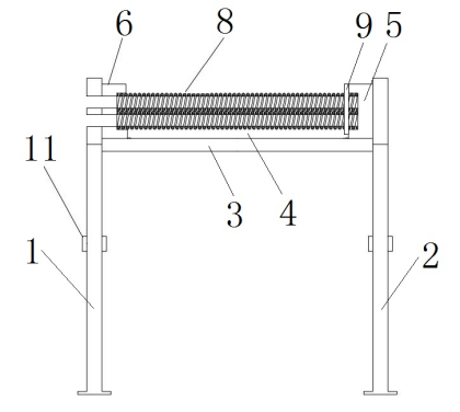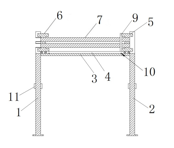 1、前立柱;2、后立柱;3、连接梁;4、滑轨;5、固定横梁;6、活动横梁;7、中心导杆;8、弹簧;9、缓冲垫;10、声光蜂鸣器开关;11、声光蜂鸣器。