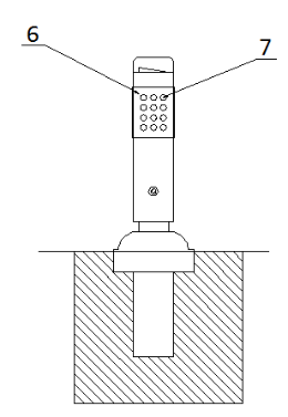 本实用新型提供一种技术方案:一种弹性基础可调节式柱式轮廓标,结构如图1-3所示,包括底座1、外壳2、蓄电池3、太阳能发电板4、透明护罩5、逆反光件6和余晖发光件7,底座1的底部嵌入地下,底座1采用橡胶柔性材料,既能稳定轮廓标,又能改变轮廓标角度,如图4所示,当车辆剐蹭本设计产品时,底座1发生形变,从而改变整个柱式轮廓标的位置,借此达到保护柱式轮廓标不被损毁的目的。底座1与外壳2通过螺栓8连接,外壳2底部有第一圆孔,底座1与外壳2连接处等距离设置有若干个第二圆孔,第一圆孔与第二圆孔尺寸匹配,配合螺栓8实现弹性基础可调节式柱式轮廓标调节高度的功能。外壳2是由聚氯乙烯塑料构成的四方形断面立柱,外壳2侧面设置有逆反光件6和余晖发光件7,逆反光件6采用逆反射材料。外壳2内部设置有蓄电池3,蓄电池3与太阳能发电板4之间、蓄电池3与余晖发光件7之间均通过电线连接,外壳2上端设置有太阳能发电板4,太阳能发电板4外设有透明硬材料制作的透明护罩5,用以保护太阳能发电板4。太阳能发电板4上设置有光亮传感器,太阳能发电板4下安装自动旋转装置,分布在太阳能发电板4上的光亮传感器接受不同位置的太阳光强度,光亮传感器将光信号转化为电信号,再传输至自动旋转装置,自动旋转装置改变太阳能发电板4的角度。