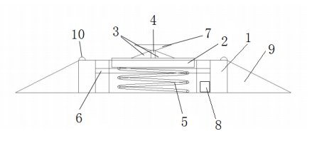 本实用新型提供一种技术方案:一种基于品红的潮汐车道装置,如图1-4所示,包括装置壳体1,所述装置壳体1上表面上设置有可远程操控的加热装置2,所述加热装置2上端设置有两个品红溶液三棱柱3,所述品红三棱柱3内设置有品红溶液和二氧化硫气体,且密闭不会透出气体或液体,从而不影响大气环境。两个所述品红溶液三棱柱3间设置有一个白色背景板4,其作用是突出1品红溶液三棱柱的颜色,并且防止驾驶员看见离驾驶员较远的一个1品红溶液三棱柱的颜色,从而导致驾驶员无法判断的情况。所述加热装置2下方连接有弹簧5,可与上面部分一起下降,车离去时,自动回弹原高度。所述加热装置2与弹簧5间设置有保护柱6,当车需要变道时,且必须压到本实用新型装置时,保护柱6配合弹簧5一起下降,并且减小加热装置2的倾斜幅度。所述白色背景板4的上端面与倒圆锥体相连,所述倒圆锥体的上端面上设置有太阳能电池板7,给蓄电池8在白天储存电量,并给装置供电,且其不会挡住驾驶员看1品红溶液三棱柱的视线。所述太阳能电池板7与设置于装置壳体1内部的蓄电池8相连,所述蓄电池8与加热装置2相连。所述装置壳体1通过四个螺栓10固定于地面上。所述品红溶液三棱柱3为直角三棱柱。所述装置壳体1的两侧各设置有一个缓冲坡9。