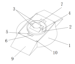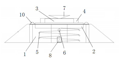 1、装置壳体;2、加热装置;3、品红溶液三棱柱;4、白色背景板;5、弹簧;6、保护柱;7、太阳能电池板;8、蓄电池;9、缓冲坡;10、螺栓。