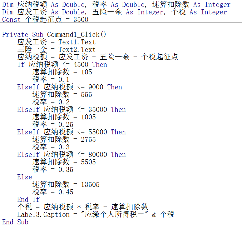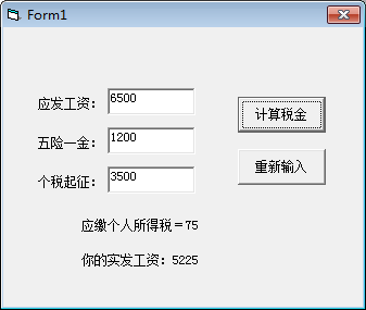 2011年我国将个税起征点由2000元调整为3500元,你知道我们的工资个税的计算方法吗?本例是一个计算工资个人所得税的程序,运行结果如图2所示。本节将这个实例介绍VB中的基本规则,语句书写规则、关键字、标识符。