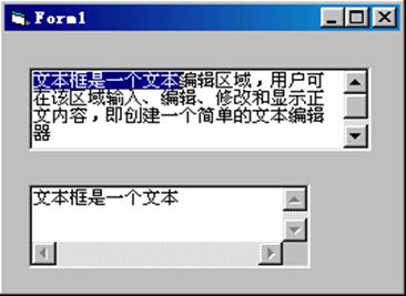⑴ 创建界面。在窗体上添加2个文本框Text1、Text2。其中,Text1的Text属性设置为:“文本框是一个文本编辑区域,用户可在该区域输入、编辑、修改和显示正文内容,即创建一个简单的文本编辑器”。