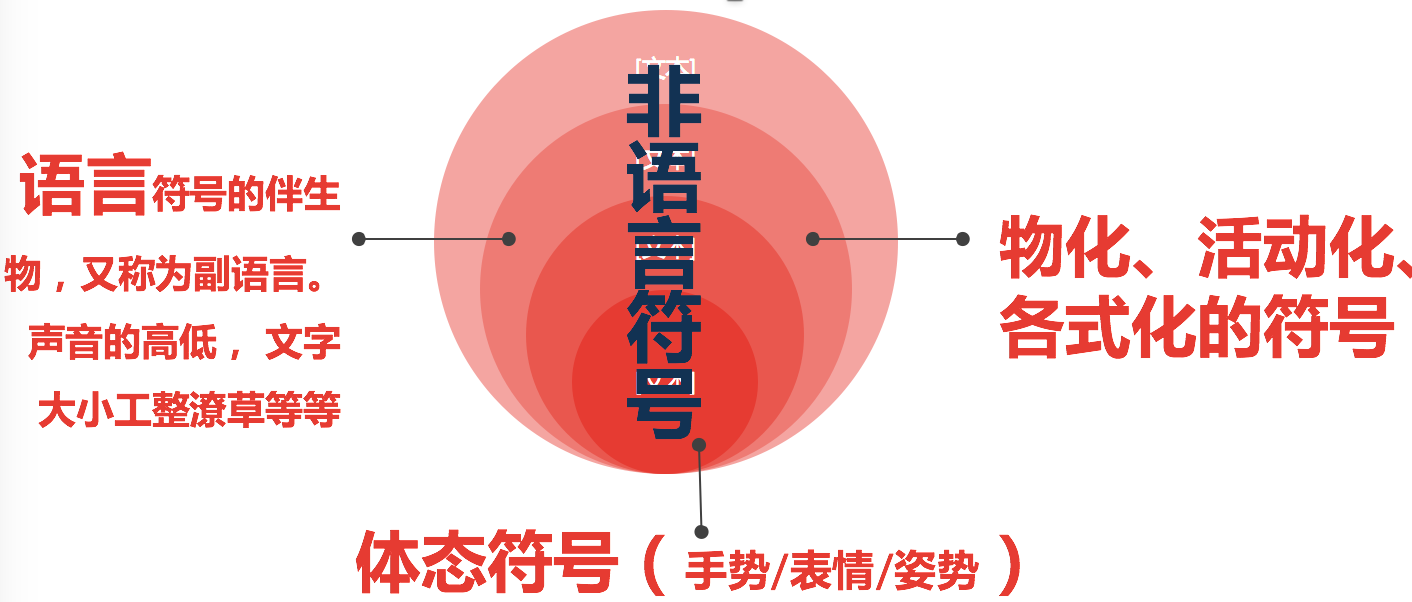 非语言符号主要包括:副语言、体态符号、物化 活动化 各式化的符号
