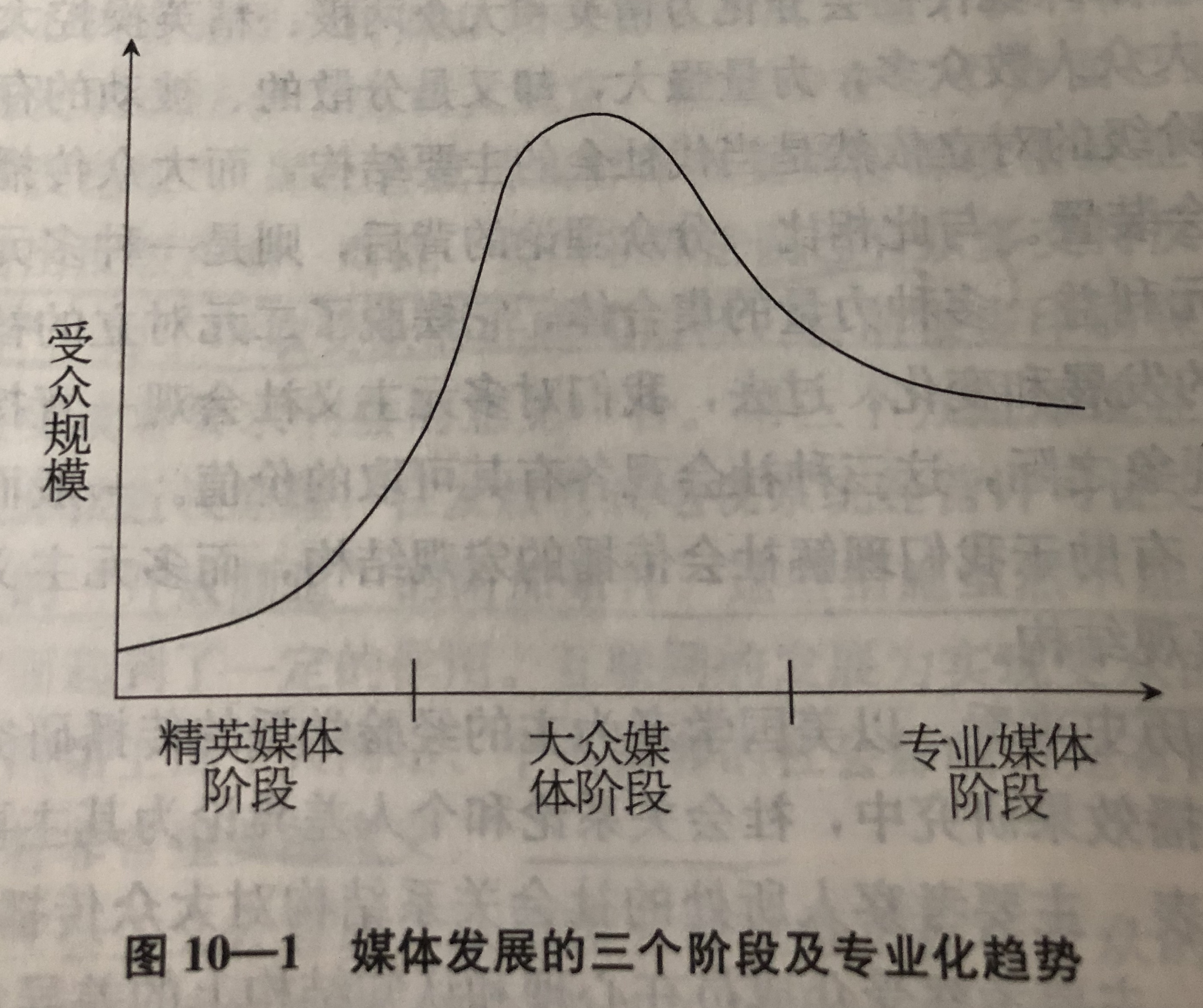 大众报刊、电影、通俗读物、广播的出现和发展迎来了大众媒体阶段。这个阶段的特点是国民教育已经高度普及、中产阶级称为社会的主流人群、媒介接触和使用成本不断降低、受众的规模达到顶峰,因而在内容上,则是力图满足最大多数人的最基本的信息需求。