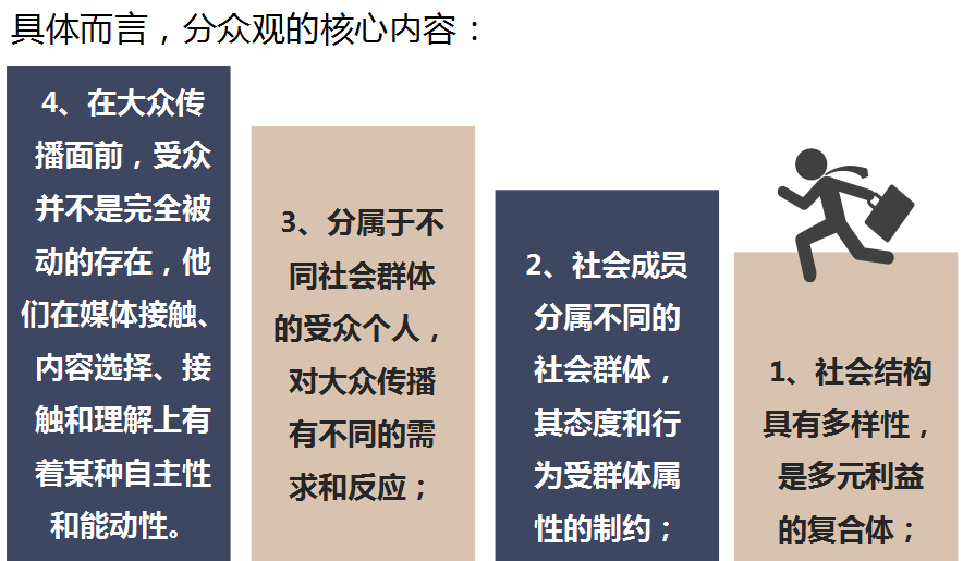 分众,指的是受众并不是同质的孤立个人的集合,而是具备了社会多样性的人群。
