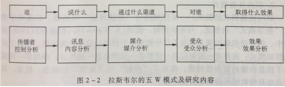 后来大众传播学研究的五大领域即“控制研究”、“内容分析”“媒介分析”“受众分析”和“效果分析”就是沿着“5W”模式的这条思路形成的。