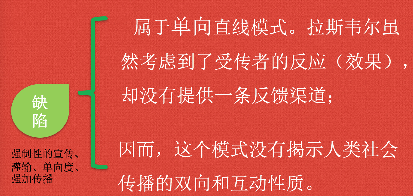 意义:拉斯韦尔“5W”模式第一次将人们每天从事却又阐述不清的传播活动明确表述为由五个环节和要素构成的过程,为人们理解传播过程的结构和特性提供了具体的出发点。