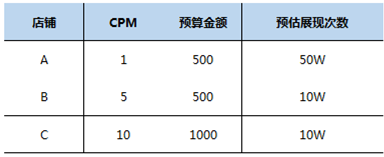 现有A,B,C三家店铺在做钻石展位时,共同选择了同一个展位进行推广。在不考虑时间、地域、定向投放方式等因素情况下,只按照竞价展现,假设本展位日均流量30W。