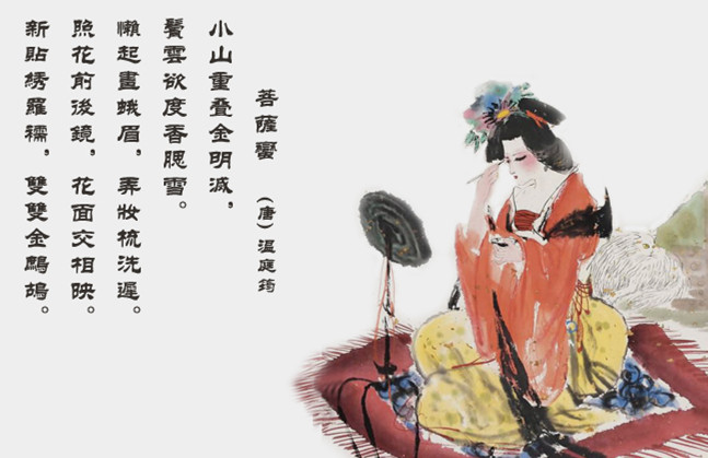 《菩萨蛮》,本唐教坊曲,后用为词牌,也用作曲牌。亦作《菩萨鬘》,又名《子夜歌》、《重叠金》等。唐宣宗大中年间,女蛮国派遣使者进贡,她们身上披挂着珠宝,头上戴着金冠,梳着高高的发髻,让人感觉宛如菩萨,当时教坊就因此制成《菩萨蛮曲》,于是后来《菩萨蛮》成了词牌名。另有《菩萨蛮引》、《菩萨蛮慢》。《菩萨蛮》也是曲牌名,属北曲正宫,字句格律与词牌前半阕同,用在套曲中。此调用韵两句一换,凡四易韵,平仄递转,以繁音促节表现深沉而起伏的情感,历来名作最多。