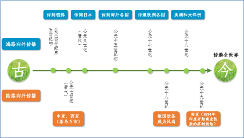 中国是茶的故乡。自西汉(公元前206年至公元8年)开始,中国茶开始销往东南亚各国,随着丝绸之路、茶马古道、万里茶路的开辟与兴盛,至明朝十七世纪初期,中国茶已经远销至东西欧各国。其中,1607年荷兰海船自爪哇来澳门运载绿茶,并于1610年转运欧洲,标志着中国茶叶正式输入欧洲。