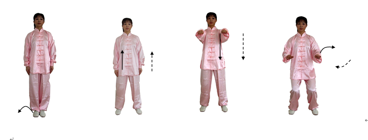 (1) 身体自然站立,两脚分开与肩同宽,脚尖向前,两臂自然下垂,两手放在大腿外侧;精神集中,目视前方。