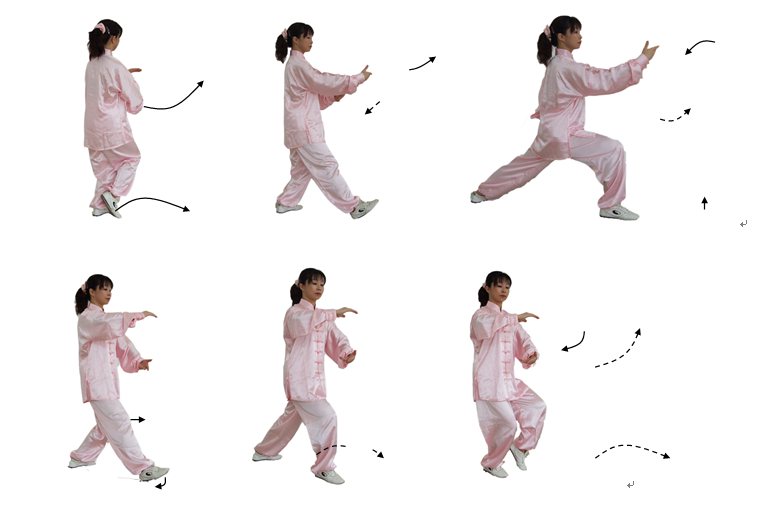 (2) 上体微向左转,左脚向左前方迈出,右脚跟后蹬,右腿自然伸直,成弓步,同时上体继续向左转,左右手随转体慢慢分别向左上、右下分开,左上高与眼平(手心歇向上),肘微屈;右手落在右胯旁,肘也微屈,手心向下,指尖向前,目视左手。