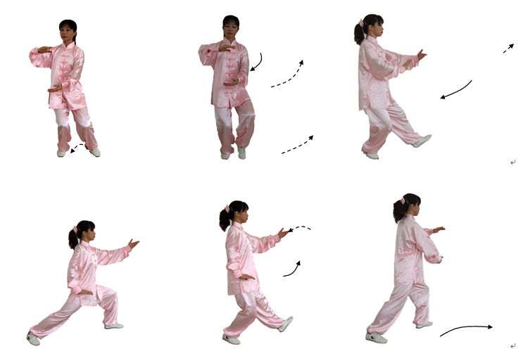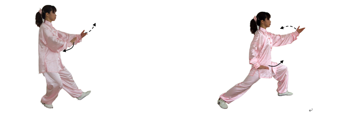 要点:上体中正,两臂分开时要保持弧形,弓步动作与分手的速度要均匀一致;身体转动时要以腰为轴带动上肢做动作;移动重心时上体要保持平稳,不可前俯后仰;胸部宽松舒展。