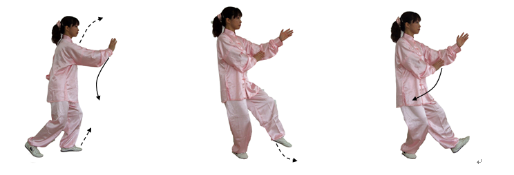 (3) 右腿慢慢屈膝,上体后坐,重心移至右腿,左脚尖翘起微向外撇,随后脚掌慢慢踏实,左腿前弓,身体左转,重心移至左腿,右脚收至左脚内侧,脚尖点地,同时左手向外翻掌,由左后向上划弧至左肩外侧,肘微屈,手与耳同高,手心斜向下,目视左手。