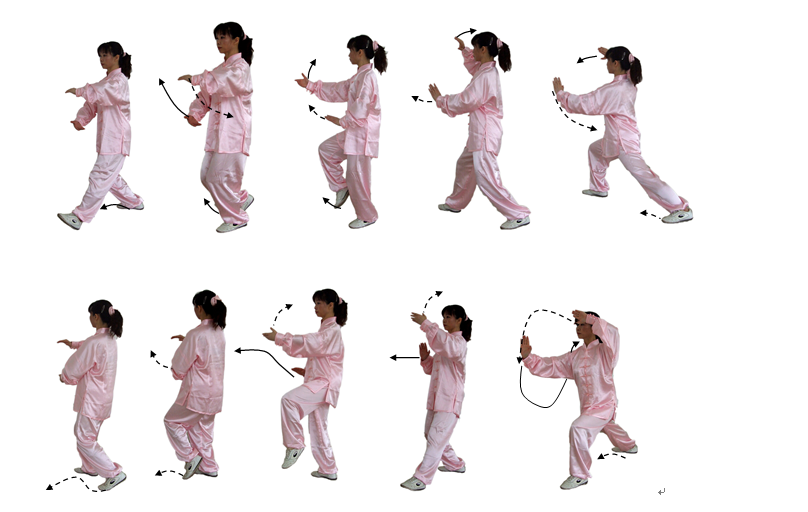 (1) 身体微向左转,左脚向前落地,脚尖外撇,右脚跟离地,两腿屈膝成半做盘式,同时两手在左胸前成抱球状(左上右下),然后右脚收到左脚内侧,脚尖点地,目视左手。