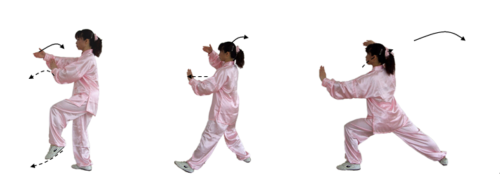 (3) 身体重心略向后移,右脚尖稍向外撇,随即重心再移至右腿,左腿跟进,停于右脚内侧,脚尖点地,同时两手在右胸前成抱球状(右上左下),目视右手。
