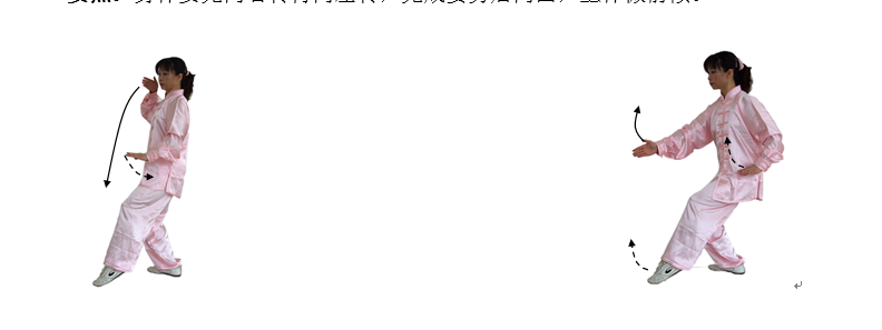 要点:推掌、架掌与弓腿动作要协调一致;上体不可太前倾;弓步时两脚横向距离同“揽雀尾”动作,不超过10厘米。