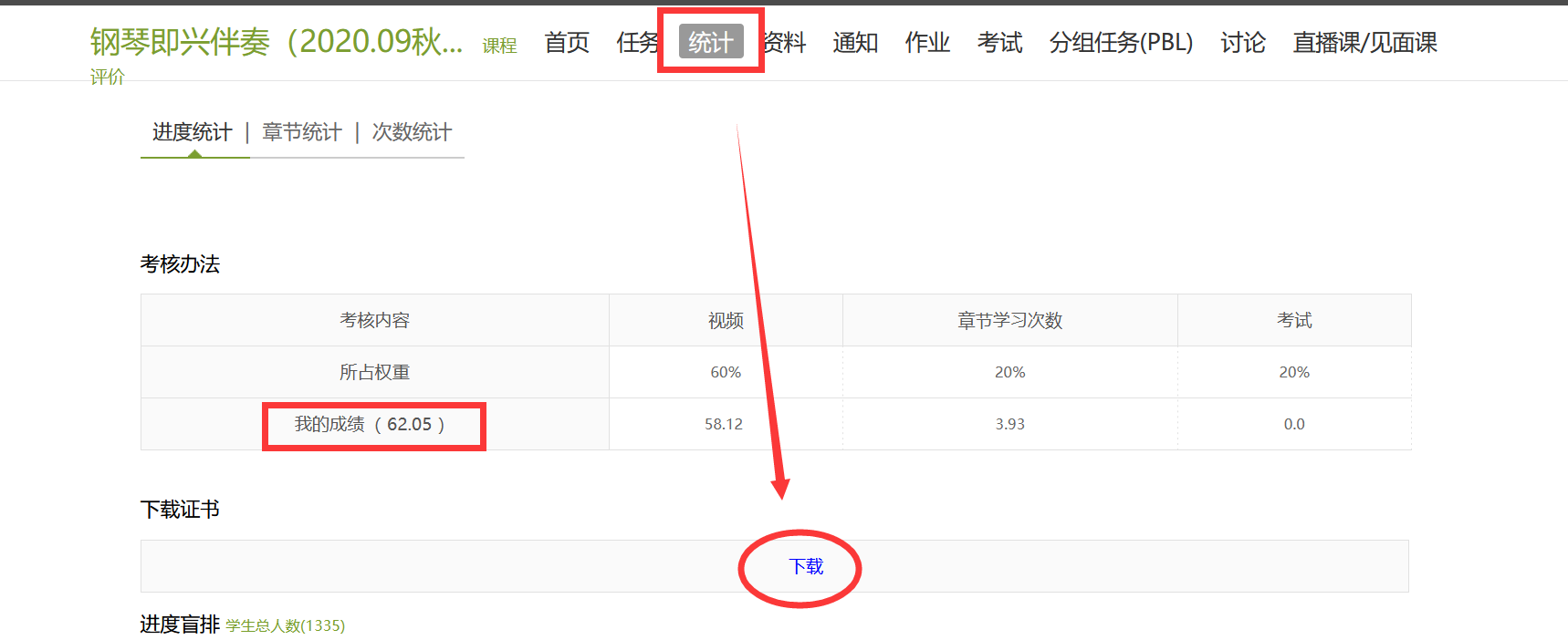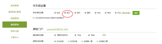 (1)配置学生端“统计”模块,在【管理-课程管理】,在【学生端设置】处勾选“统计”并保存。一般默认都勾选