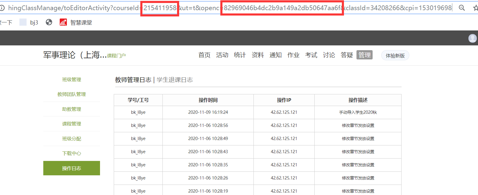 登陆状态下,找一门您的泛雅课程,点击操作日志链接,替换其中的courseid和openc后面的参数。
