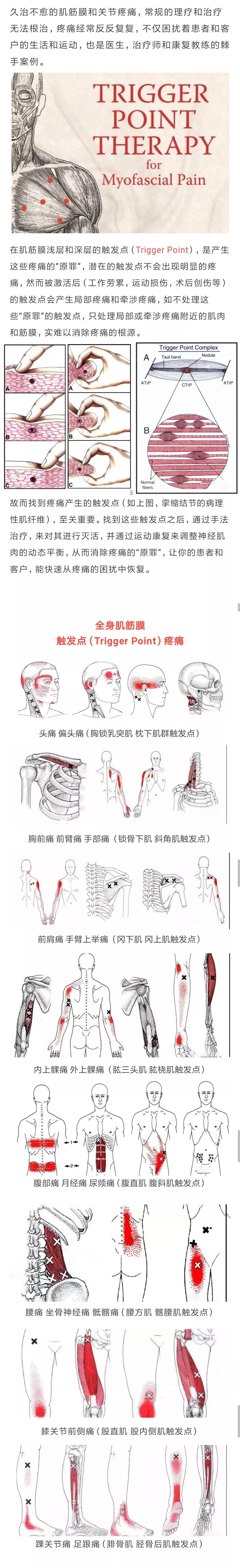 “激痛点”亦名“扳机点”或“触发点”,是指骨骼肌内可触及的紧绷肌带中存在的局部高度敏感的压痛点。激痛点是西方针刺疗法dry needling,即干针疗法的理论基础。大多数的激痛点位于骨骼肌的肌腹,其范围很小,属于局部肌纤维的紧张和挛缩,这种挛缩虽不会影响整块肌肉的功能,但会影响局部肌纤维的正常运作,同时,挛缩的肌纤维会形成结节,甚至形成条索状物,进而牵扯肌筋膜,激活疼痛感受器,最终引发疼痛,而其产生的原因多数是因为肌肉的慢性劳损,牵拉刺激,受力失衡所致。如果某块肌肉的激痛点长期得不到治疗,就会造成机体局部的力学失衡,而同一力学功能的其他骨骼肌也会受到间接的过用性损伤,造成整个关节系统的紊乱。而针刺激痛点治疗肌筋膜疼痛综合征,其原理即是对激痛点进行灭活,是挛缩的肌纤维得以松解,从而减轻局部组织张力,促进血液循环,这与针刺解结结筋病灶点的原理相同,都是解除已经机械化的条索和结节,从而缓解疼痛,这与中医所说的“针至病所”的治疗原则极为相似。
