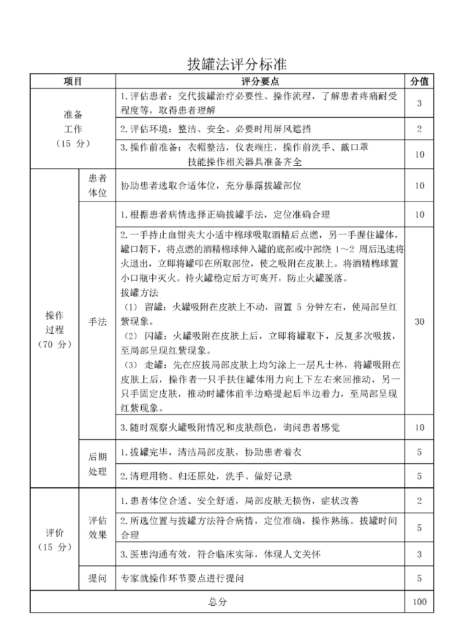 10 | 4、手法效果:操作熟练流畅,能达到拔罐效果,患者耐受,皮肤有罐斑。 | 1-手法操作熟练流畅,达到一定效果=果,得分:9-10分(优) |