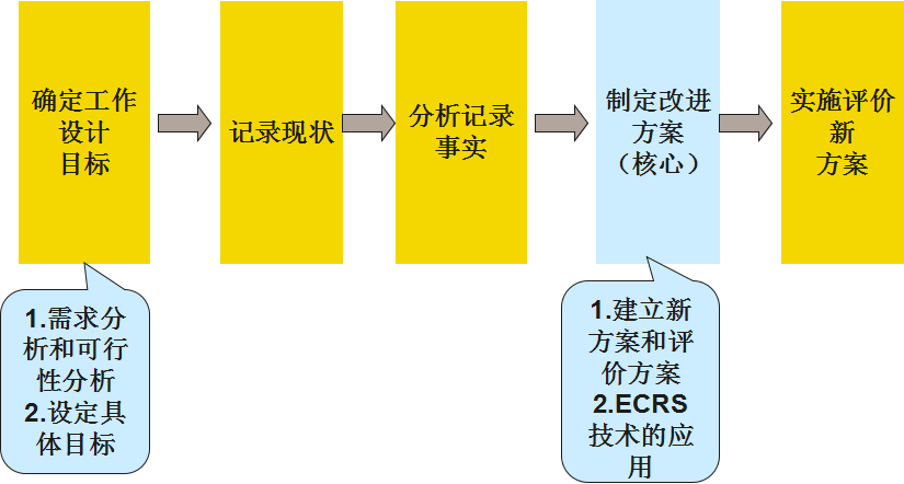 工作设计的技术方法从技术的角度,根据劳动分工或专业化的原则,对生产过程或工艺流程中的各个组成部分、环节、活动、操作及其相互关系进行记录、分析和评价的方法。