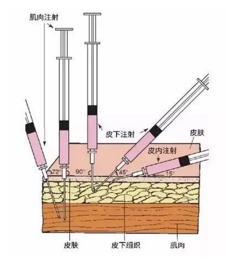 皮下注射是将少量药液注入皮下组织。它与皮内注射的区别在于:皮内注射是打在皮肤组织内;皮下注射是穿过皮肤,打在皮肤与肌肉之间。因而,皮下注射进针比皮内注射深,角度稍大,与皮肤表面约为45度角,针头也稍大一些。