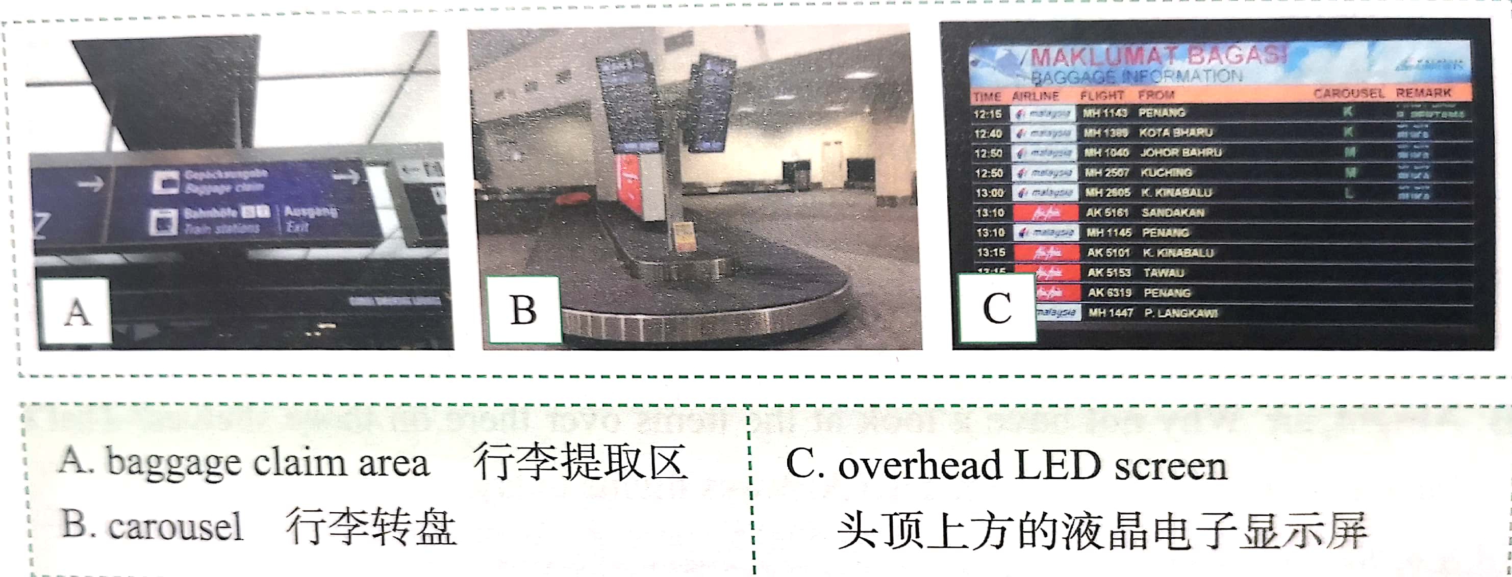 A. baggage claim area 行李提取区 B. carousel 行李转盘:C. overhead LED screen头顶上方的液晶电子显示屏
