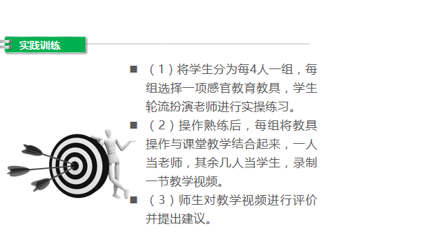 感官教具的操作分为基本操作和延伸操作两种。在熟练掌握基本操作的基础上,能有创意地设计延伸操作。