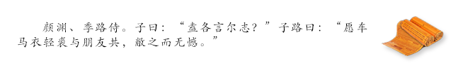 颜回、子路侍立在孔子身旁(颜渊:名回,字子渊。季路:名由,字子路或季路)。孔子说(子:男子的尊称,这里指孔子):“何不各自谈谈你们的志向呢(盍:何不)?”