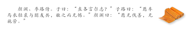 颜渊说:“(我)愿做到不夸耀自己的好处(伐:夸耀),不把劳苦施加在别人身上。”