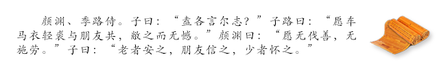 颜渊说:“(我)愿做到不夸耀自己的好处(伐:夸耀),不把劳苦施加在别人身上。”