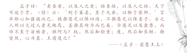 敬爱自己的长辈,进而也敬爱别人的长辈;爱抚自己的孩子,进而也爱抚别人的孩子。(这样)天下就可以在掌心中随意转动(要统一它就很容易了)。《诗经》上说:‘先给妻子做榜样,再给兄弟好影响,凭这治家和安邦。’是说要把这样的用心推广到各个方面罢了。所以,如果广施恩德就足以安抚天下,不施恩德,连妻子儿女也安稳不住。古代的贤明君主之所以远远超过一般人,没有别的原因,只是善于将他们所做的推广开去罢了。现在(大王的)恩德已施行了禽兽身上,而功德却体现不到百姓身上,偏偏是什么原因呢?称一称,然后才知道轻重;量一量,然后才知道长短。万物都是这样,人心更是如此。大王请认真地考虑考虑吧!